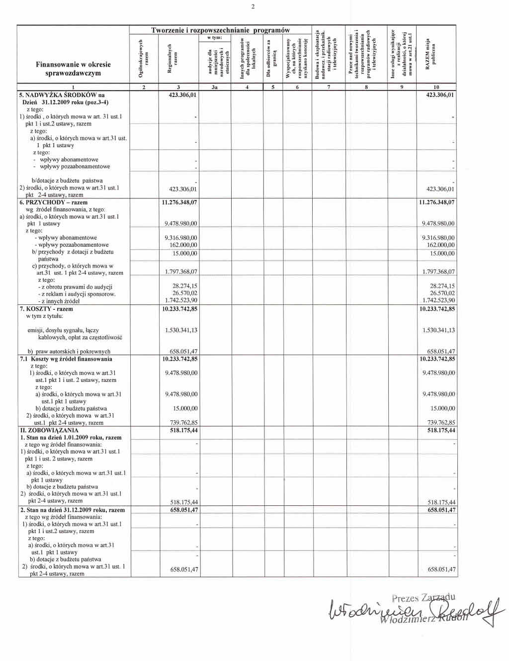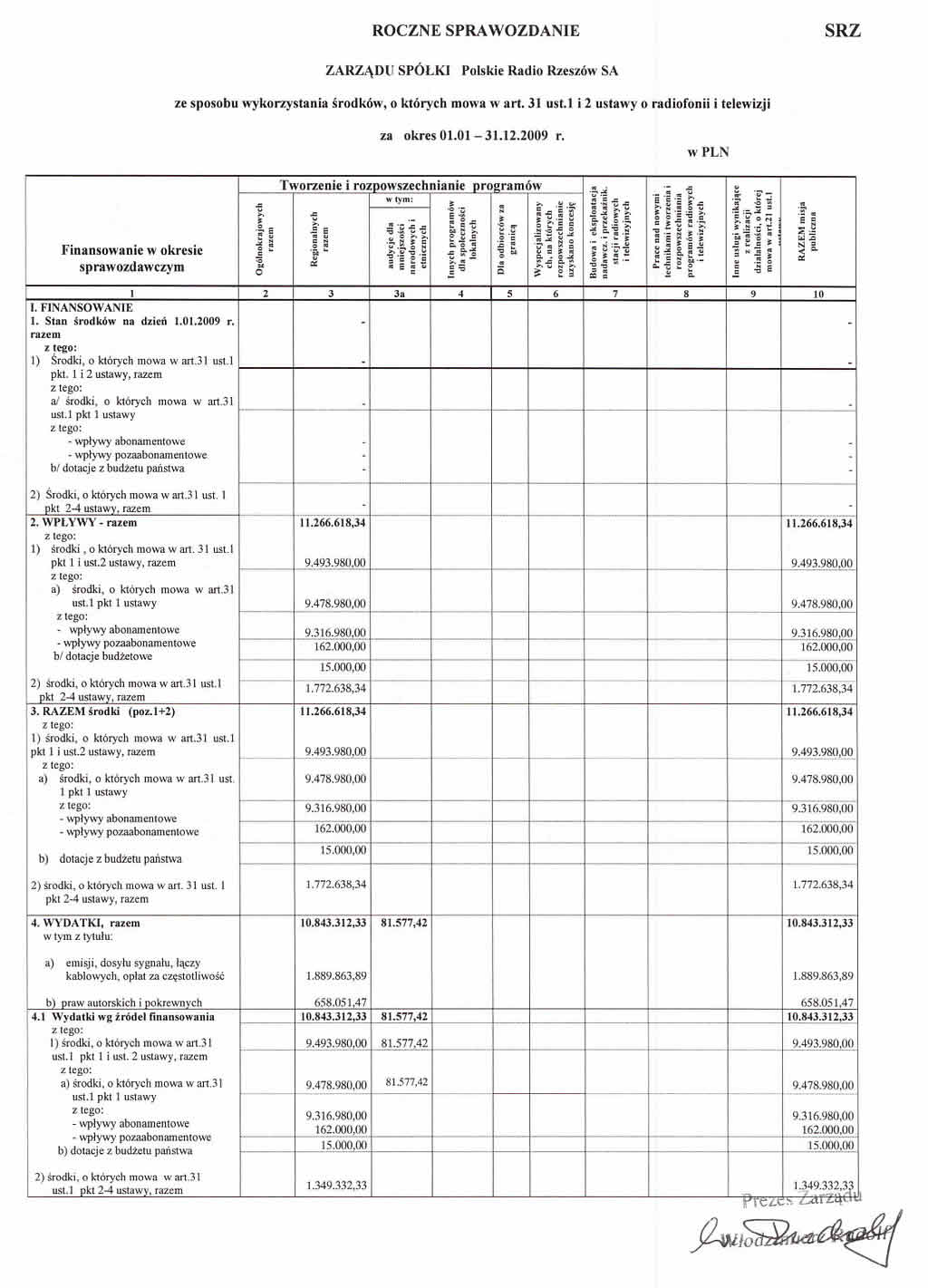 Roczne sprawozdanie zarządu spółki Polskie Radio Rzeszów S.A. ze sposobu wykorzystania środków, o których mowa w art. 31 ust. 1 i 2 ustawy z dnia 29 grudnia 1992 r. o radiofonii i telewizji za okres 01.01 - 31.12.2009 r.