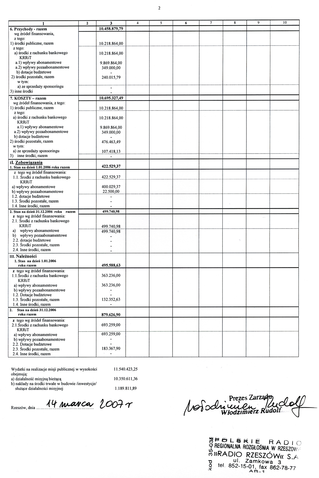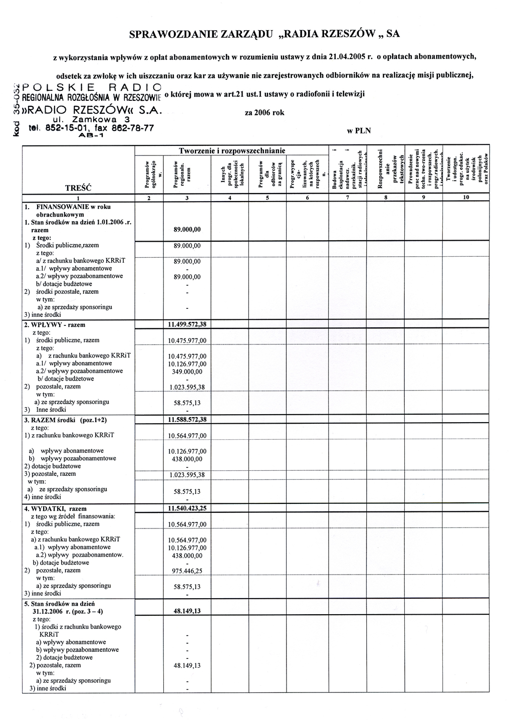 Roczne sprawozdanie zarządu spółki Polskie Radio Rzeszów S.A. ze sposobu wykorzystania środków, o których mowa w art. 31 ust. 1 i 2 ustawy z dnia 29 grudnia 1992 r. o radiofonii i telewizji za okres 01.01 - 31.12.2006 r.