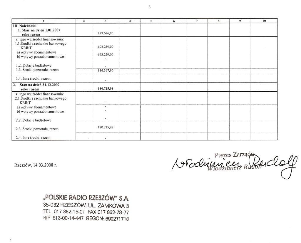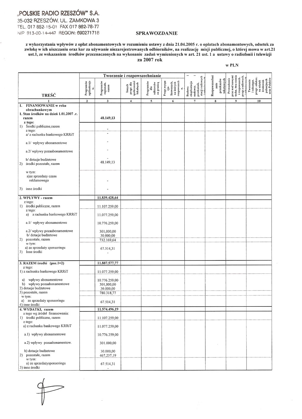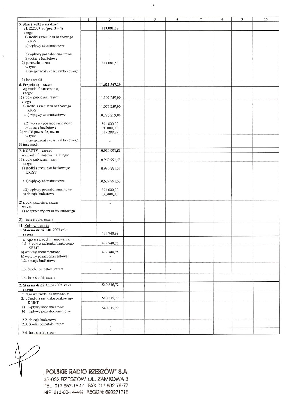 Roczne sprawozdanie zarządu spółki Polskie Radio Rzeszów S.A. ze sposobu wykorzystania środków, o których mowa w art. 31 ust. 1 i 2 ustawy z dnia 29 grudnia 1992 r. o radiofonii i telewizji za okres 01.01 - 31.12.2007 r.